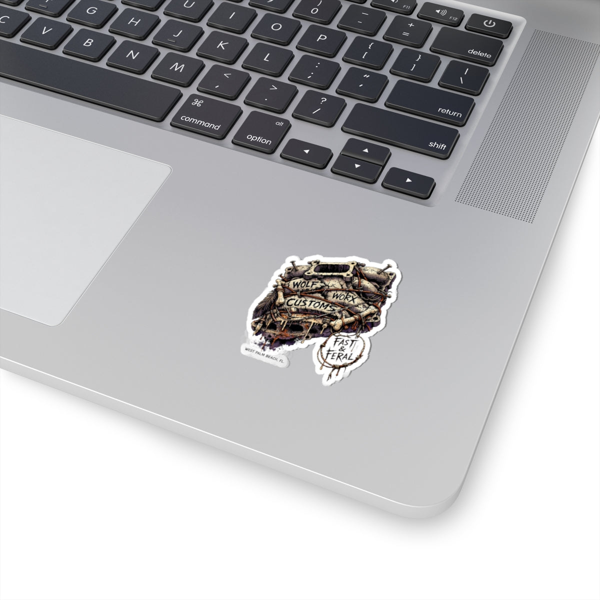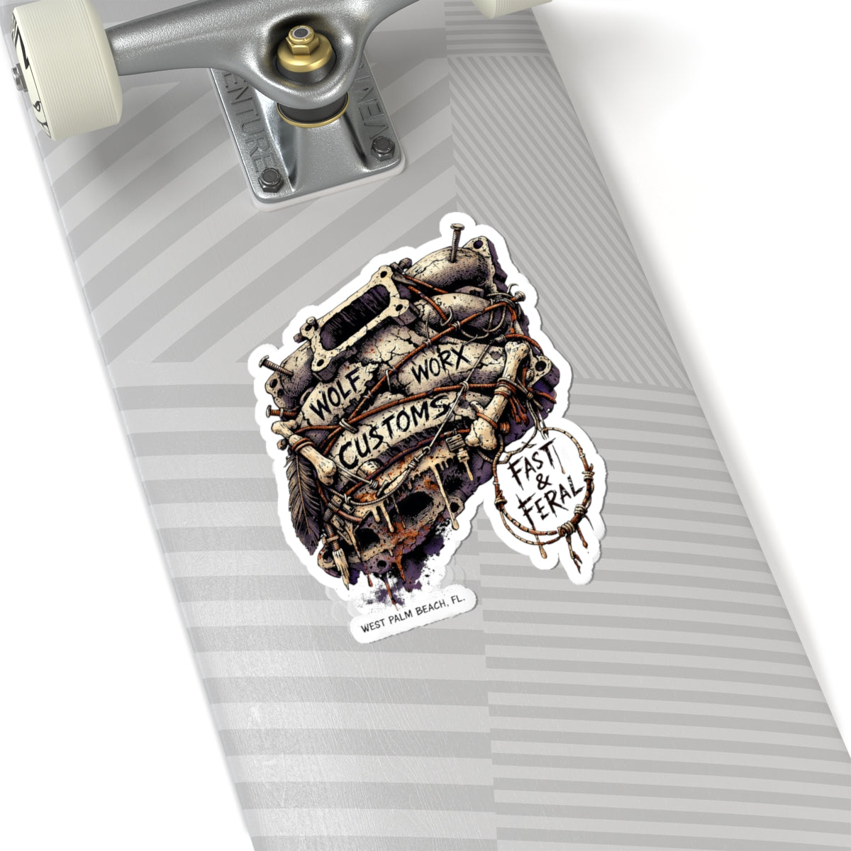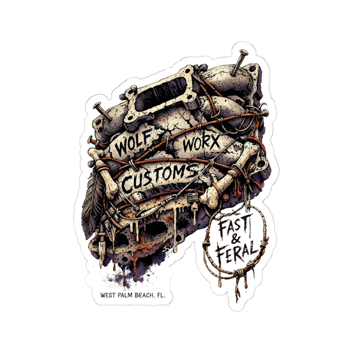 At its core, this sticker line fuses the entire Wolf Worx universe into one cohesive visual ecosystem. Wolf Worx Customs brings the backbone: heritage hot-rod culture, custom car authority, performance obsession, audio discipline, mechanical credibility, and a shop-born standard of execution that refuses to feel cheap, novelty, or mass-produced. Fast & Feral brings the bite: a women-led, femme-forward design voice rooted in confidence, dominance, flirtation, gothic-femme edge, playful menace, and unapologetic presence. Together, these stickers become more than decoration—they become territorial markers.