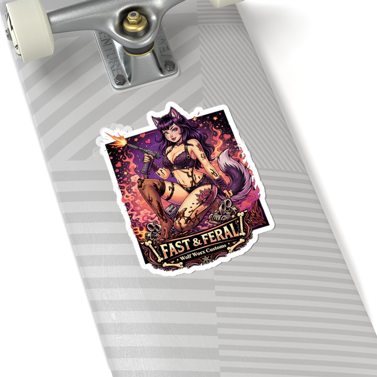 At its core, this sticker line fuses the entire Wolf Worx universe into one cohesive visual ecosystem. Wolf Worx Customs brings the backbone: heritage hot-rod culture, custom car authority, performance obsession, audio discipline, mechanical credibility, and a shop-born standard of execution that refuses to feel cheap, novelty, or mass-produced. Fast & Feral brings the bite: a women-led, femme-forward design voice rooted in confidence, dominance, flirtation, gothic-femme edge, playful menace, and unapologetic presence. Together, these stickers become more than decoration—they become territorial markers.