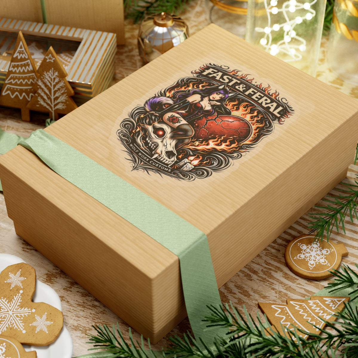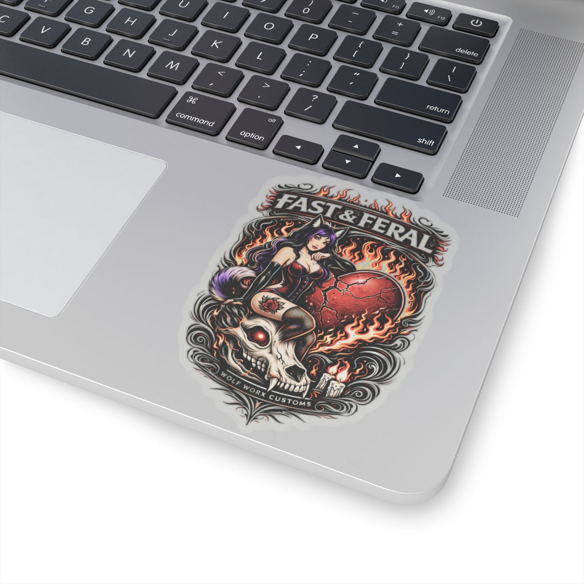 At its core, this sticker line fuses the entire Wolf Worx universe into one cohesive visual ecosystem. Wolf Worx Customs brings the backbone: heritage hot-rod culture, custom car authority, performance obsession, audio discipline, mechanical credibility, and a shop-born standard of execution that refuses to feel cheap, novelty, or mass-produced. Fast & Feral brings the bite: a women-led, femme-forward design voice rooted in confidence, dominance, flirtation, gothic-femme edge, playful menace, and unapologetic presence. Together, these stickers become more than decoration—they become territorial markers.