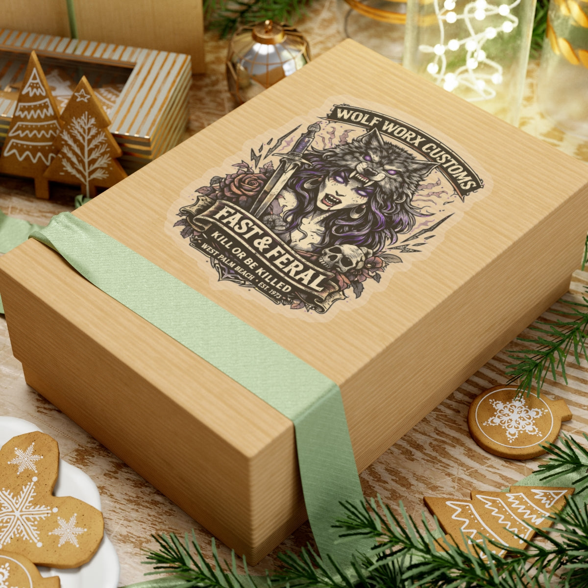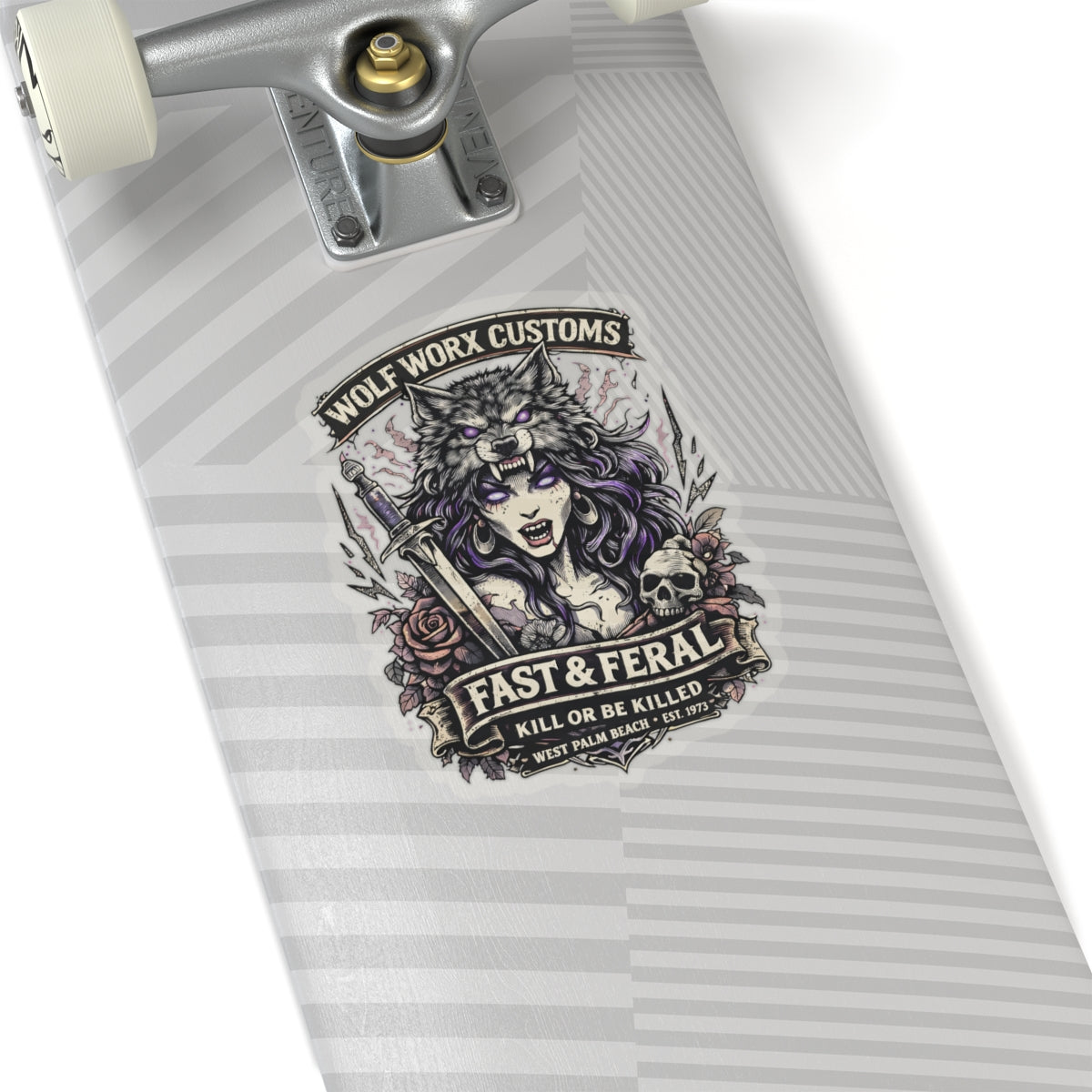 At its core, this sticker line fuses the entire Wolf Worx universe into one cohesive visual ecosystem. Wolf Worx Customs brings the backbone: heritage hot-rod culture, custom car authority, performance obsession, audio discipline, mechanical credibility, and a shop-born standard of execution that refuses to feel cheap, novelty, or mass-produced. Fast & Feral brings the bite: a women-led, femme-forward design voice rooted in confidence, dominance, flirtation, gothic-femme edge, playful menace, and unapologetic presence. Together, these stickers become more than decoration—they become territorial markers.