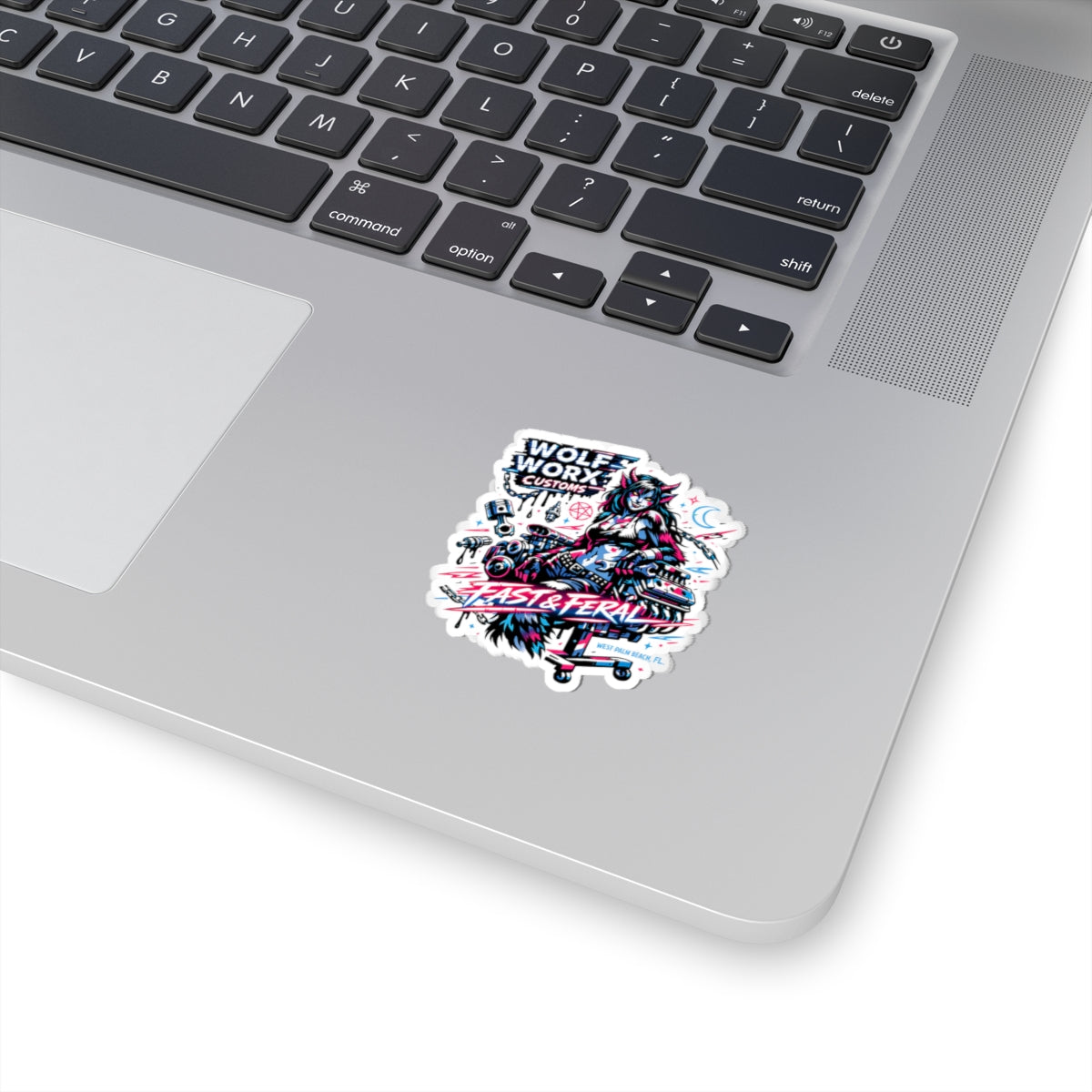 At its core, this sticker line fuses the entire Wolf Worx universe into one cohesive visual ecosystem. Wolf Worx Customs brings the backbone: heritage hot-rod culture, custom car authority, performance obsession, audio discipline, mechanical credibility, and a shop-born standard of execution that refuses to feel cheap, novelty, or mass-produced. Fast & Feral brings the bite: a women-led, femme-forward design voice rooted in confidence, dominance, flirtation, gothic-femme edge, playful menace, and unapologetic presence. Together, these stickers become more than decoration—they become territorial markers.