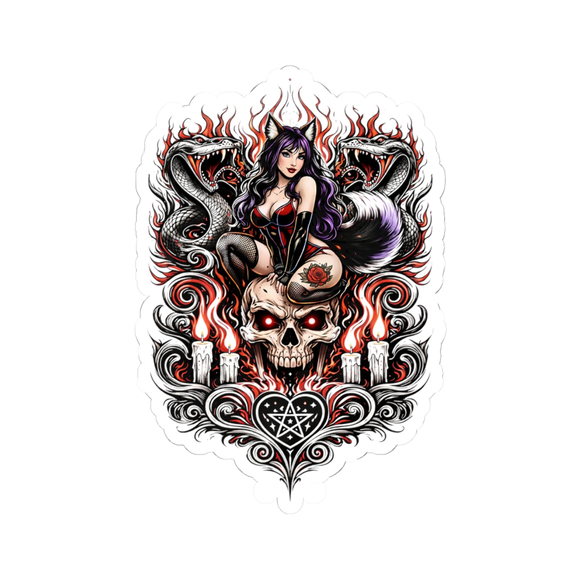Visually, the collection pulls from the shared Wolf Worx and Fast & Feral design language: bold iconography, wolf symbolism, fire-and-steel energy, heritage pinstripe influence, tattoo-flash attitude, dark streetwear sensibility, pin-up lineage, and femme power that isn’t softened for comfort. Some stickers read like badges of honor. Others feel like flirtatious threats. Some are cute on purpose. Some are aggressive on purpose. All of them belong together.